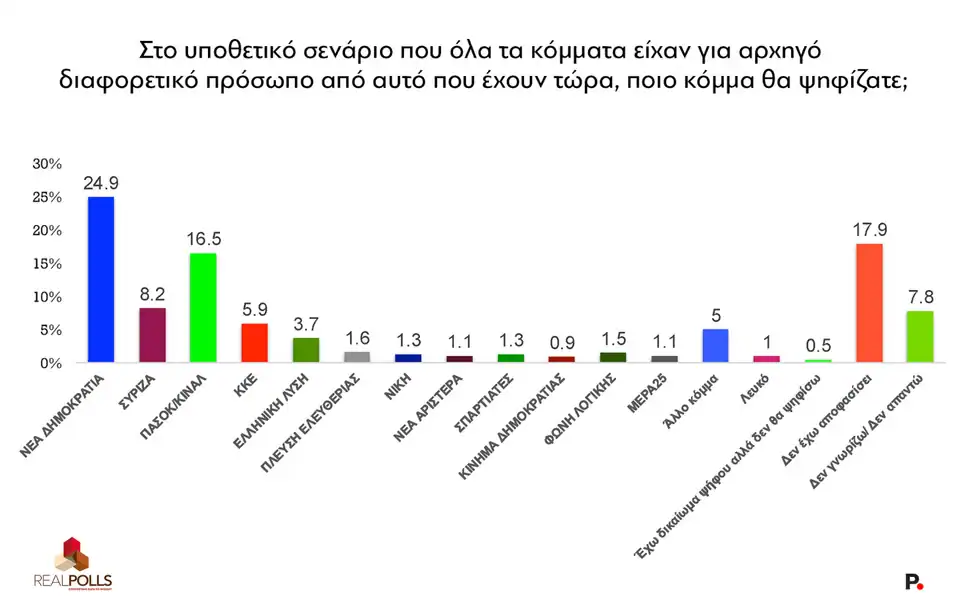 Στην πρόθεση ψήφου, η Νέα Δημοκρατία μετρήθηκε στο 24,2%, καταγράφοντας άνοδο 0,4% σε σύγκριση με την προηγούμενη μέτρηση, ενώ το ΠΑΣΟΚ-ΚΙΝΑΛ έφτασε ξανά στο διψήφιο, 10%, κερδίζοντας 1,4% από τον Οκτώβριο. Η υποχώρηση της Πλεύσης Ελευθερίας στο 6,1% (από 7,6%) έδωσε την ευκαιρία στην Ελληνική Λύση να περάσει στην τρίτη θέση με 7,5% στην πρόθεση ψήφου (από 7,2%). Πέμπτο είναι το ΚΚΕ με 6% (από 5,7%) και στην έκτη θέση (!) αναρριχήθηκε η Φωνή της Λογικής με 4,3% (από 3,8%), κερδίζοντας από την υποχώρηση του ΣΥΡΙΖΑ στο 3,5% (από 4,5%) και του ΜέΡΑ25 στο 3,2% (από 4,4%).