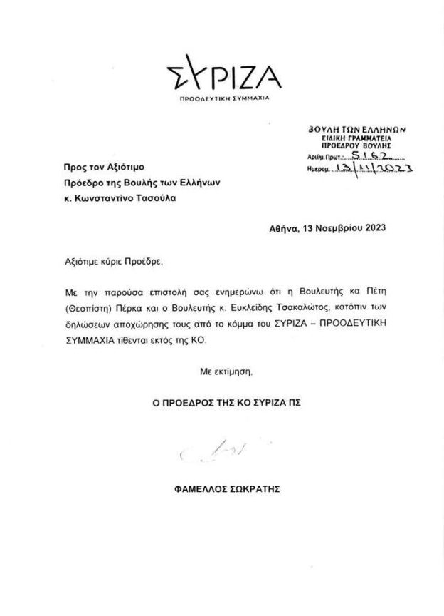 Επιστολή προς τον πρόεδρο της Βουλής Κώστα Τασούλα με την οποία τον ενημερώνει ότι «η βουλευτής κα Πέτη (Θεοπίστη) Πέρκα και ο βουλευτής κ. Ευκλείδης Τσακαλώτος, κατόπιν των δηλώσεων αποχώρησής τους από το κόμμα του ΣΥΡΙΖΑ-ΠΡΟΟΔΕΥΤΙΚΗ ΣΥΜΜΑΧΙΑ τίθενται εκτός της ΚΟ», απέστειλε ο πρόεδρος της Κοινοβουλευτικής Ομάδας του κόμματος της αξιωματικής αντιπολίτευσης, Σωκράτης Φάμελλος.