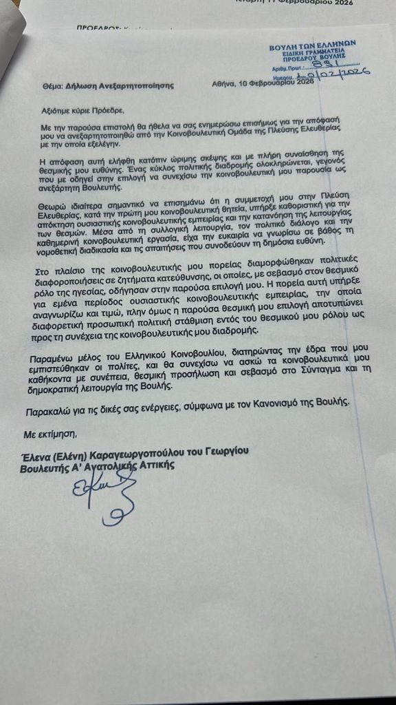 «Η απόφασή μου να συνεχίσω ως ανεξάρτητη Βουλευτής είναι αποτέλεσμα μιας διαφορετικής πολιτικής στάθμισης ως προς τον τρόπο άσκησης του κοινοβουλευτικού ρόλου και την ανάγκη ενίσχυσης του ουσιαστικού κοινοβουλευτικού ελέγχου» τονίζει, μεταξύ άλλων, στην επιστολή της προς τον πρόεδρο της Βουλής, με την οποία γνωστοποιεί την ανεξαρτητοποίησή της από την Πλεύση Ελευθερίας, η βουλευτής Ανατολικής Αττικής, Έλενα Καραγεωργοπούλου.