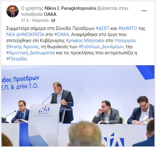 «Συμμετείχα σήμερα στη Σύνοδο Προέδρων ΔΕΕΠ και ΔΗΜΤΟ της Νέας Δημοκρατίας στο ΟΑΚΑ» έγραψε ο υπουργός Εθνικής ‘Αμυνας και πρόσθεσε: «Αναφέρθηκα στο έργο που επιτεύχθηκε επί κυβέρνησης Κυριάκου Μητσοτάκη στο υπουργείο Εθνικής ‘Αμυνας, τη θωράκιση των Ενόπλων Δυνάμεων, την Αμυντική Διπλωματία και τις προκλήσεις που αντιμετωπίζει η πατρίδα».