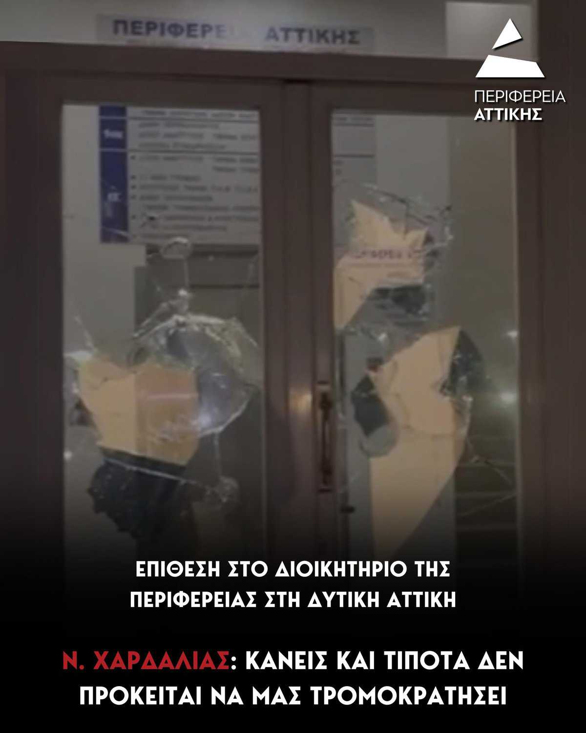 Εκτεταμένες υλικές ζημιές προκάλεσε ομάδα κουκουλοφόρων στο κτίριο του Διοικητηρίου της Περιφέρειας στη Δυτική Αττική, επί της οδού Ηρώων Πολυτεχνείου, στην Ελευσίνα, μετά από επίθεση που πραγματοποιήθηκε τα μεσάνυχτα της Τετάρτης.