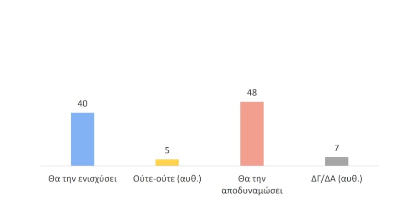 Ταυτόχρονα, η σχετική πλειοψηφία (48%) εκτιμά ότι το αποτέλεσμα των Ευρωεκλογών θα αποδυναμώσει την ΕΕ στο άμεσο μέλλον παρά ότι θα την ενισχύσει (40%).