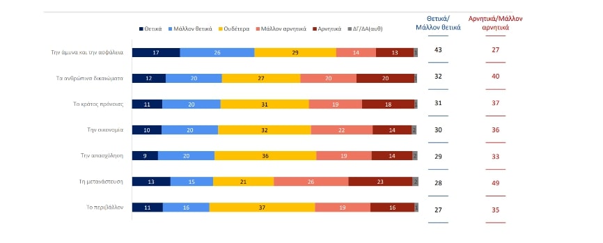 Αντίθετα, σε όλα τα υπόλοιπα πεδία πολιτικής αναμένεται αρνητική επίδραση: στο κράτος πρόνοιας, στην οικονομία και στην απασχόληση, και ιδιαιτέρως στη μετανάστευση, όπου το 28% των ερωτηθέντων πιστεύει ότι θα έχει θετική ή μάλλον θετική επίδραση, σε σύγκριση με το 49% που προβλέπει αρνητική ή μάλλον αρνητική επίδραση. Αρνητική εκτίμηση υπάρχει επίσης για τα ανθρώπινα δικαιώματα και το περιβάλλον.