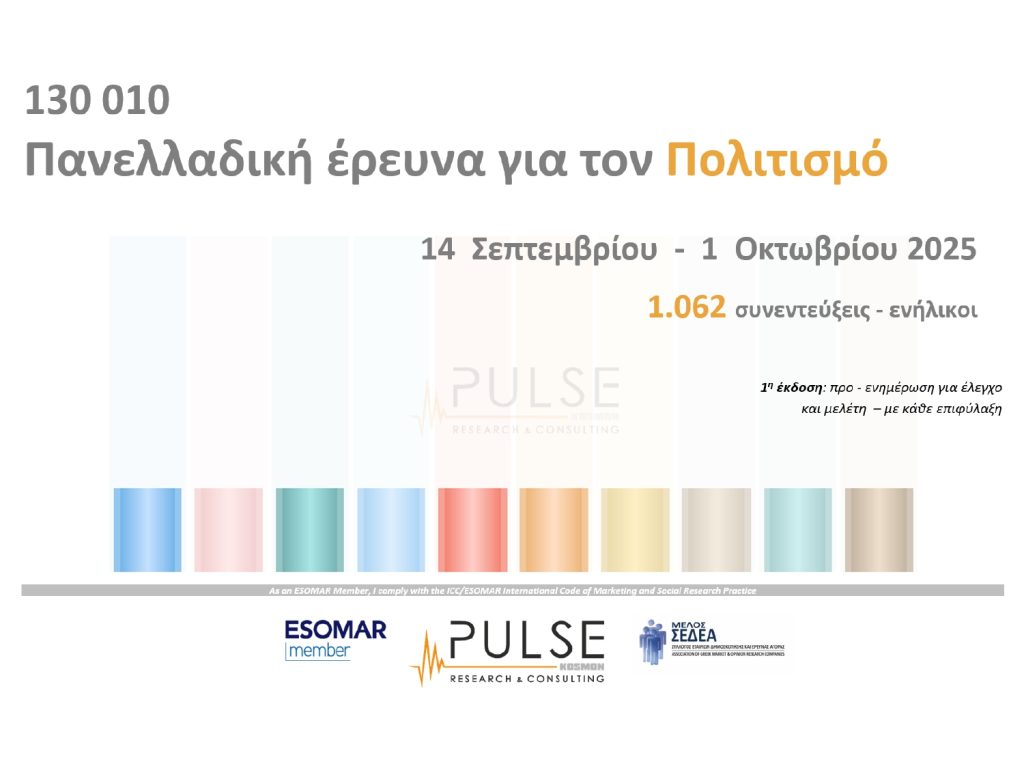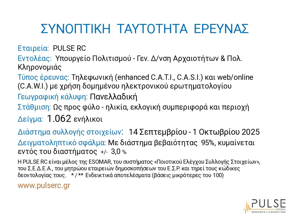 “Τα στοιχεία της συγκεκριμένης έρευνας επιβεβαιώνουν την αίσθηση που έχουμε όλοι, ότι δηλαδή οι Έλληνες διατηρούμε μία σημαντική, για κάποιους από εμάς ίσως σταθερή και ουσιαστική, σύνδεση με τα μνημεία, τους αρχαιολογικούς χώρους και τα μουσεία της χώρας”, δήλωσε ο Γ. Αράπογλου ξεκινώντας την παρουσίαση της έρευνας, που διεξήχθη από τις 14 Σεπτεμβρίου έως την 1η Οκτωβρίου 2025 και στην οποία συμμετείχαν 1.062 ενήλικοι Έλληνες. Το δείγμα ήταν αντιπροσωπευτικό και σύμφωνο με την απογραφή του 2021, όσον αφορά το φύλλο, την ηλικία, την περιοχή κατοικίας, αλλά και τις κομματικές επιλογές.