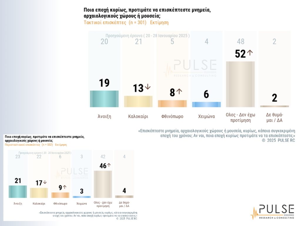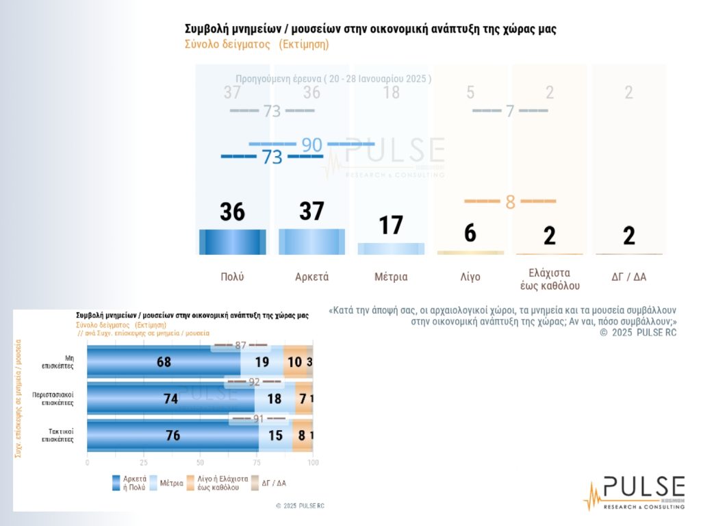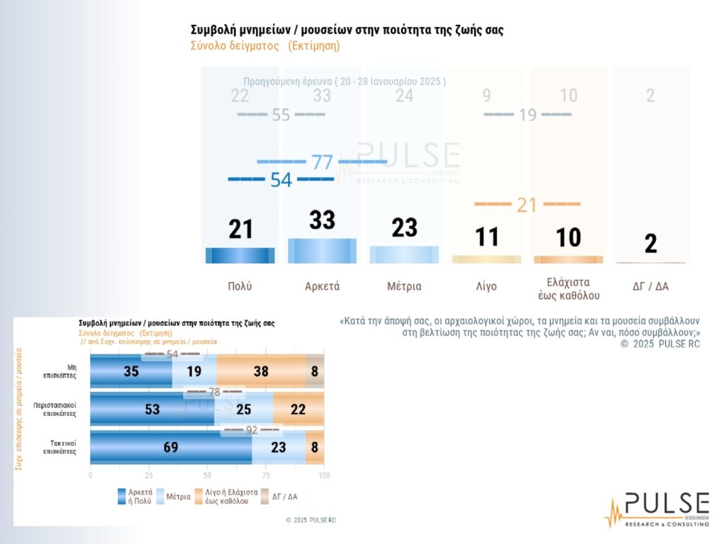 Σύμφωνα με τα αποτελέσματα της έρευνας, στο ερώτημα για τη συχνότητα επίσκεψης σε μνημεία, αρχαιολογικούς χώρους και μουσεία, το 50% είπε ότι τα επισκέπτεται περιστασιακά μία έως δύο φορές τον χρόνο, το 30% πως είναι τακτικοί επισκέπτες (δηλαδή από μία-δύο φορές στο εξάμηνο έως και σχεδόν κάθε μήνα), το 17% απάντησε ποτέ και το 3% επέλεξε να μην απαντήσει. Στο ερώτημα για τη συμβολή των παραπάνω χώρων στη βελτίωση της ποιότητας της ζωής τους, το 54% απάντησε αρκετά έως πολύ, ενώ αν συμπεριληφθεί και το μέτρια, το 77% θεωρεί ότι οι χώροι αυτοί συμβάλλουν στη βελτίωση της ποιότητας της ζωής τους από μέτρια και άνω. Μόνο το 21% επέλεξε τις απαντήσεις από λίγο, ελάχιστο έως καθόλου. Σύμφωνα με τη γεωγραφική κατανομή, μάλιστα, στο σύνολο του χάρτη, υπάρχει σε όλη την Ελλάδα η ίδια αντίληψη ως προς τη συμβολή.