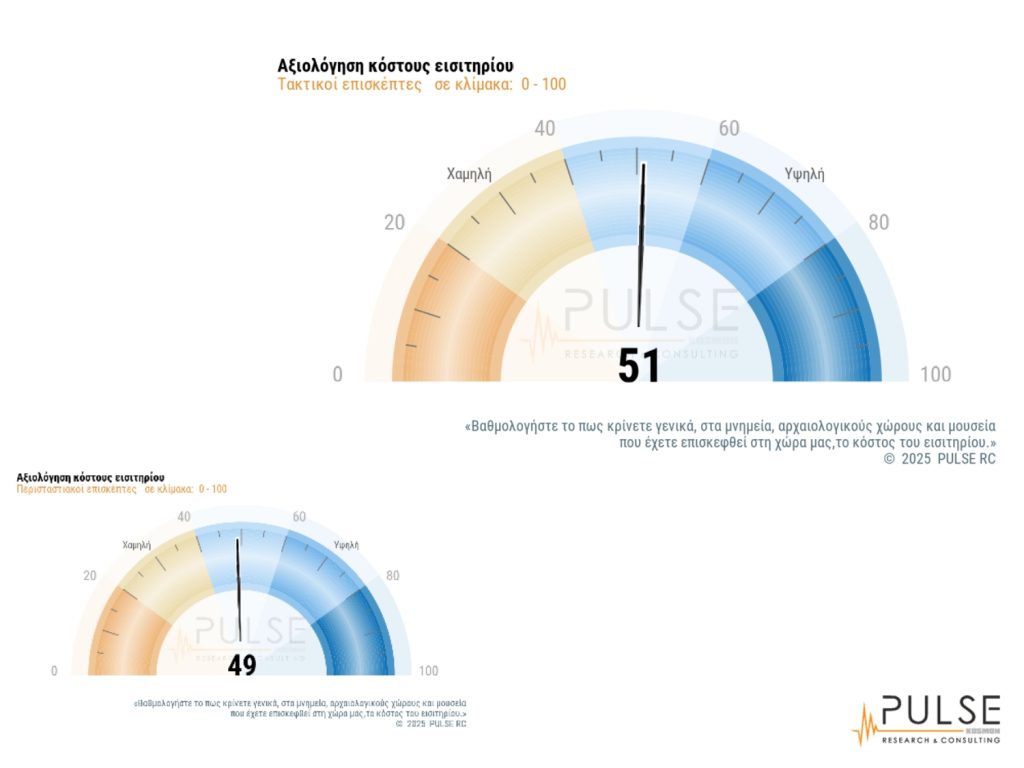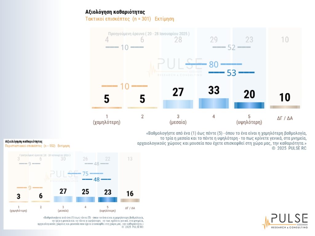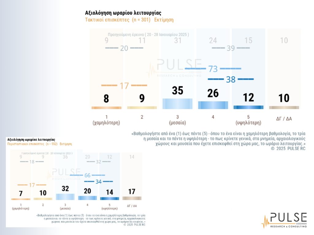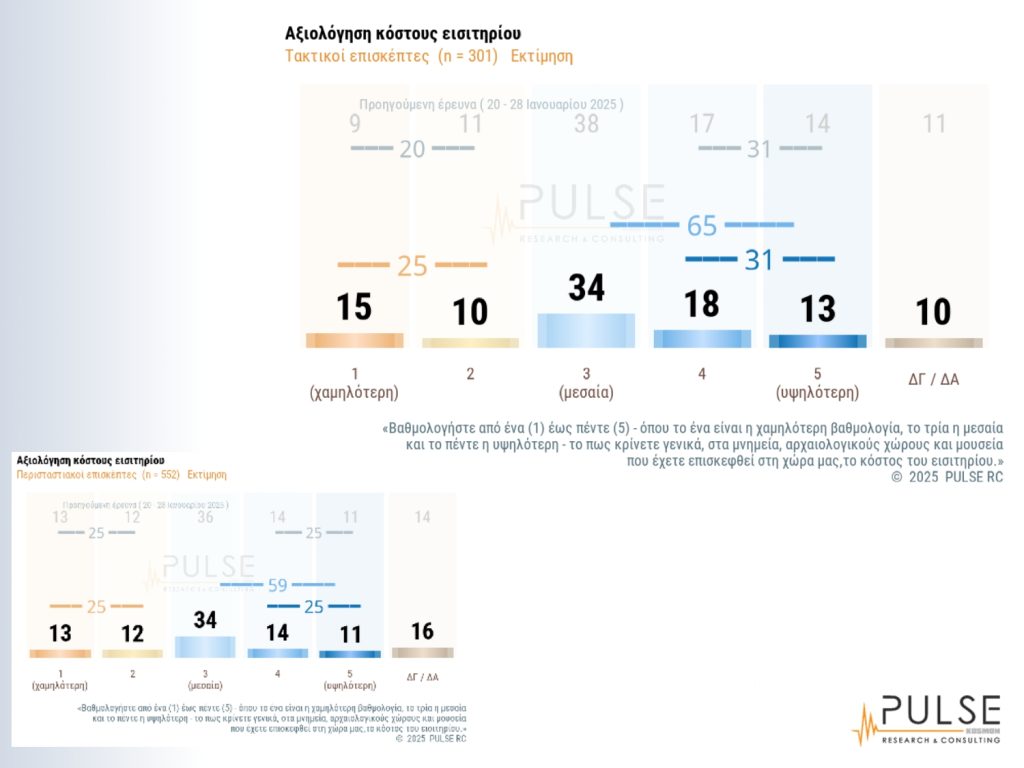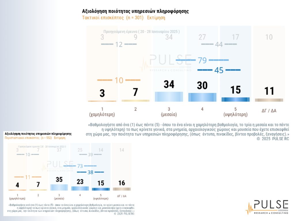 ‘Αλλη ενότητα της έρευνας αφορά τις αξιολογήσεις σε παρεχόμενες υπηρεσίες, π.χ. πληροφόρησης, όπου το 45% έδωσε υψηλή βαθμολογία και το 79% από μεσαία και άνω. Ενδιαφέρον έχουν επίσης οι ενότητες που αφορούν πιο “δύσκολα” ζητήματα, όπως η καθαριότητα και η τιμή του εισιτηρίου. Το 53% έδωσε υψηλή βαθμολογία για την καθαριότητα στους χώρους που έχουν επισκεφθεί και το 80% από μεσαία και άνω. Για το κόστος του εισιτηρίου, το 31% έδωσε υψηλή βαθμολογία, έναντι 25% που αξιολόγησε με χαμηλή βαθμολογία, ενώ το 65% έδωσε απο μεσαία βαθμολογία και άνω. Γενικά η συμπεριφορά και η γνώση του προσωπικού, η καθαριότητα, οι υπηρεσίες πληροφόρησης και η ευκολία πρόσβασης έδωσαν υψηλές αξιολογήσεις, ενώ σε πιο χαμηλές θέσεις βρέθηκαν ζητήματα, όπως το ωράριο λειτουργίας και το κόστος εισιτηρίου.