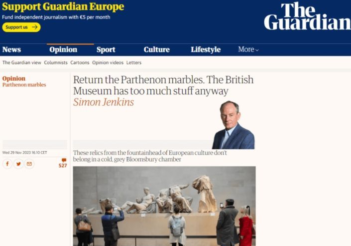 Την επιστροφή των Γλυπτών του Παρθενώνα στους νόμιμους ιδιοκτήτες τους καλεί με ένα μακροσκελές άρθρο του στον Guardian ο Σάιμον Τζένκινς.