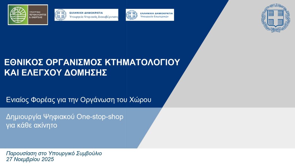 Παρουσιάστηκε σήμερα στο Υπουργικό Συμβούλιο η νομοθετική πρωτοβουλία των Υπουργείων Περιβάλλοντος και Ενέργειας, Ψηφιακής Διακυβέρνησης και Εσωτερικών, με την οποία συντελείται μία μεγάλη μεταρρύθμιση στον τρόπο εξυπηρέτησης των πολιτών σε σχέση με την ακίνητη περιουσία.