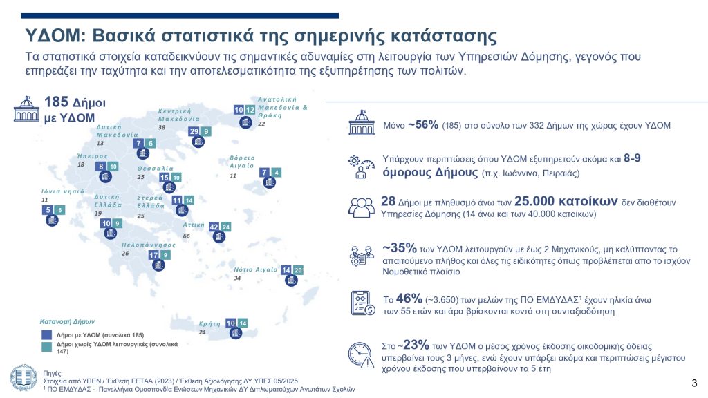 Περίπου 35% των ΥΔΟΜ λειτουργούν με έως δύο μηχανικούς, αριθμός που δεν επαρκεί για να καλύψει όλες τις ειδικότητες που απαιτεί η κείμενη πολεοδομική νομοθεσία.