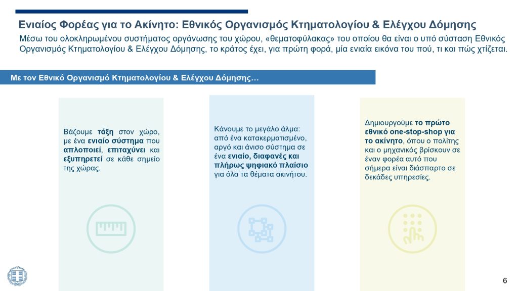 Ενοποίηση δεδομένων Κτηματολογίου και Δόμησης, ώστε το κράτος να έχει για πρώτη φορά ενιαία εικόνα του πού, τι και πώς χτίζεται.