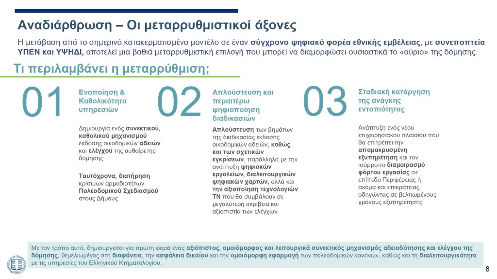 Βάση της μεταρρύθμισης είναι η ανάγκη ενός ολοκληρωμένου μηχανισμού αδειοδότησης και ελέγχου δόμησης, με ψηφιακά εργαλεία, ενιαία πρότυπα και κοινές διαδικασίες σε όλη τη χώρα. Τα στοιχεία που έχουν καταγραφεί τα προηγούμενα χρόνια θέτουν σε προτεραιότητα αυτήν την οργανωτική ενοποίηση. Ειδικότερα: