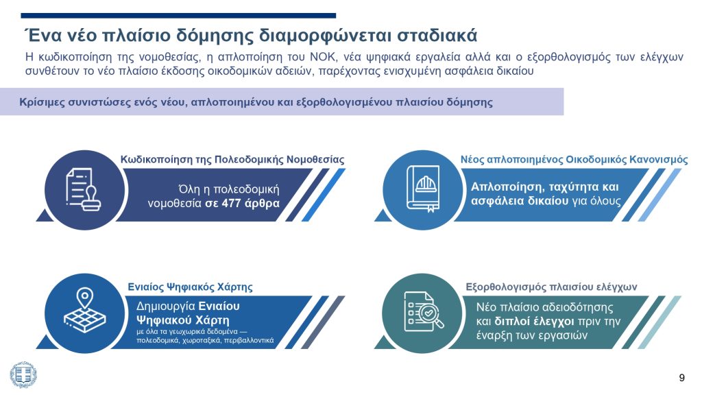 Κωδικοποίηση της πολεοδομικής νομοθεσίας σε 477 άρθρα – για πρώτη φορά όλο το πλαίσιο συγκεντρώνεται, γίνεται ξεκάθαρο και εφαρμόζεται ομοιόμορφα.