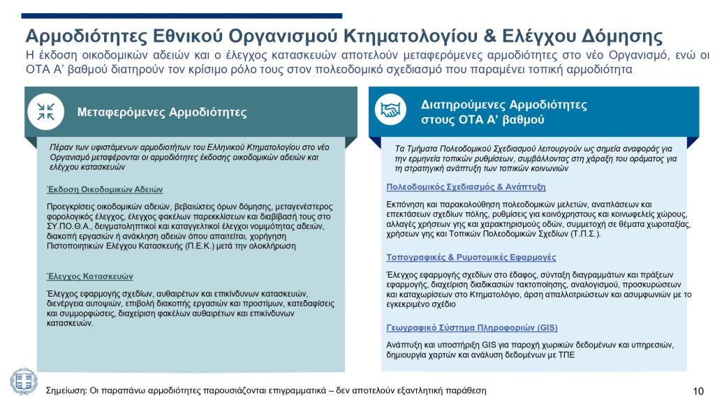 Ο νέος φορέας αναλαμβάνει την καταγραφή, τεκμηρίωση και εγγύηση της ιδιοκτησίας, την έκδοση οικοδομικών αδειών και όλων των συναφών πράξεων (βεβαιώσεις όρων δόμησης, προεγκρίσεις), τον έλεγχο των κατασκευών και την τήρηση της πολεοδομικής νομοθεσίας.