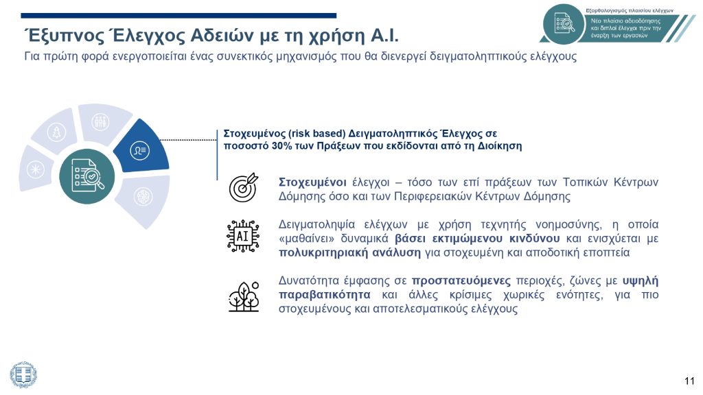 Στόχος είναι για πρώτη φορά να υπάρχει συστηματικός έλεγχος των οικοδομικών αδειών με τη βοήθεια τεχνητής νοημοσύνης, ώστε οι έλεγχοι να είναι πιο στοχευμένοι και αποτελεσματικοί.