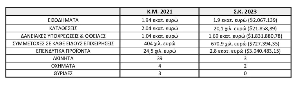 Στο έγγραφο αναφέρεται πως το 2023 ο Στέφανος Κασσελάκης είχε εισοδήματα ύψους 1,9 εκατομμυρίων ευρώ, καταθέσεις 20,1 χιλιάδες ευρώ, δανειακές υποχρεώσεις ύψους 1,69 εκατ. ευρώ, συμμετοχές σε επιχειρήσεις που αντιστοιχούν σε 670,9 χιλ.