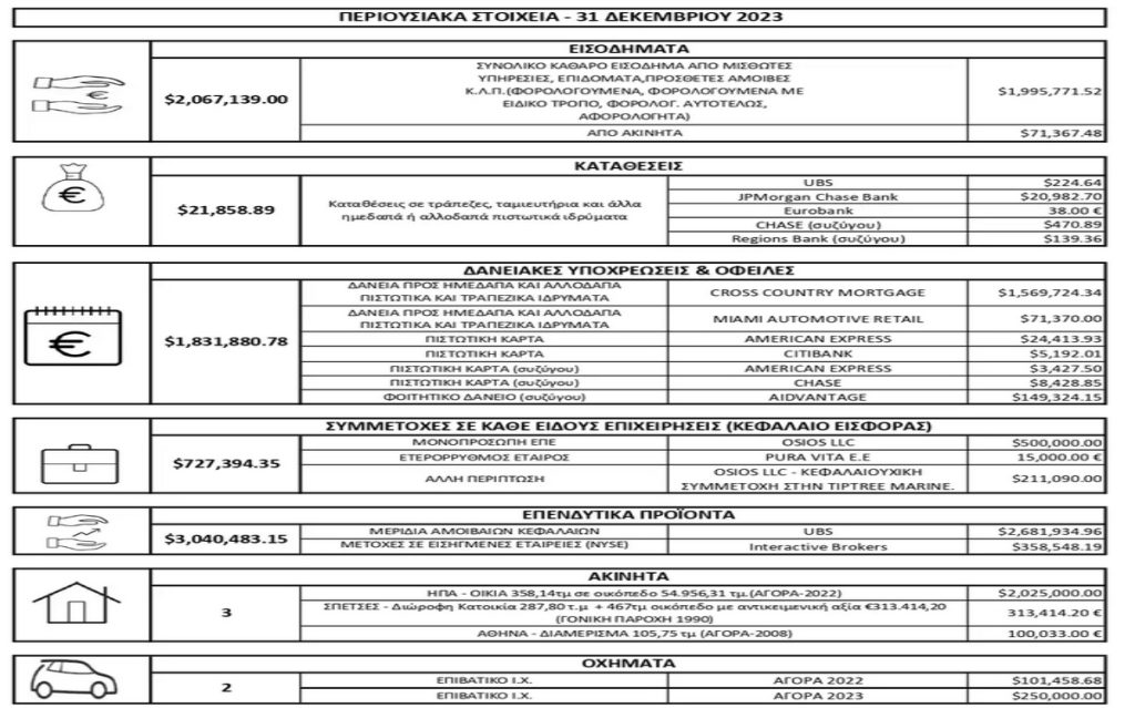 Στο έγγραφο αναφέρεται πως το 2023 ο Στέφανος Κασσελάκης είχε εισοδήματα ύψους 1,9 εκατομμυρίων ευρώ, καταθέσεις 20,1 χιλιάδες ευρώ, δανειακές υποχρεώσεις ύψους 1,69 εκατ. ευρώ, συμμετοχές σε επιχειρήσεις που αντιστοιχούν σε 670,9 χιλ.
