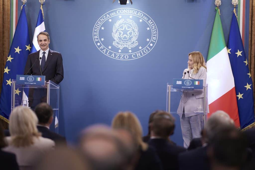 Μετά τη συνεδρίαση του Ανώτατου Συμβουλίου Συνεργασίας Ελλάδας – Ιταλίας στη Ρώμη, ο πρωθυπουργός Κυριάκος Μητσοτάκης προχώρησε σε κοινές δηλώσεις με την Ιταλίδα ομόλογό του, Τζόρτζια Μελόνι.