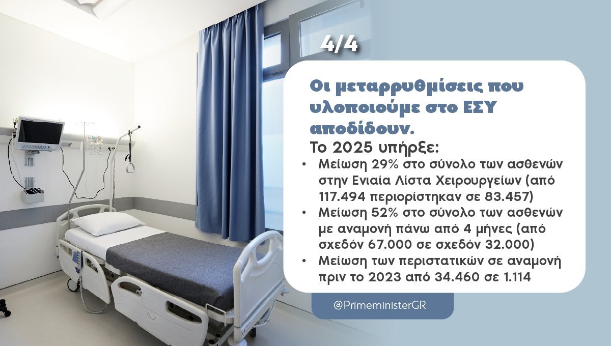 Η ίδια λογική της πράξης και του αποτελέσματος συνεχίζεται και στην υγεία, με τα αποτελέσματα από τις μεταρρυθμίσεις που υλοποιούμε να έχουν ήδη αρχίσει να φαίνονται. Το 2025 σημειώθηκε μείωση 29% στο σύνολο των ασθενών στην Ενιαία Λίστα Χειρουργείων, δηλαδή από 117.494 περιορίστηκαν σε 83.457. Ακόμα πιο σημαντικός δείκτης ωστόσο είναι η μείωση κατά 52% που καταγράφηκε στο σύνολο των ασθενών με αναμονή πάνω από 4 μήνες το ίδιο διάστημα, από σχεδόν 67.000 σε σχεδόν 32.000, όπως και η μείωση των περιστατικών σε αναμονή πριν το 2023, από 34.460 σε 1.114. Καθοριστική ήταν η συμβολή των δωρεάν απογευματινών χειρουργείων, με τη διενέργεια 11.342 δωρεάν χειρουργείων σε 70 Νοσοκομεία σε όλη τη χώρα. Τι συνέβαλε στα αποτελέσματα αυτά; Ένας συνδυασμός παρεμβάσεων που κάναμε, από την αύξηση των πρωινών τακτικών χειρουργείων, την καθιέρωση των απογευματινών και τα voucher στις ιδιωτικές κλινικές. Με μια άλλη μια σημαντική μεταρρύθμιση, το «βραχιολάκι», καταφέραμε να μειώσουμε πάνω από 65% τον μέσο χρόνο αναμονής στις εφημερίες για το 2025. Τα λύσαμε όλα; Ασφαλώς όχι, γι’ αυτό και δεν σταματάμε τις προσπάθειες. Να συμφωνήσουμε όμως ότι το ΕΣΥ αλλάζει, εξυπηρετώντας καλύτερα και γρηγορότερα τους ασθενείς.