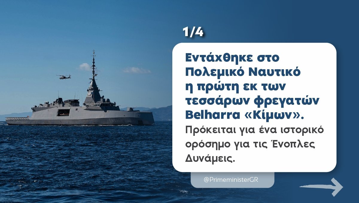 Οι στιγμές που έζησα πάνω στη γέφυρα και στο κατάστρωμα του «Κίμωνα» με έκαναν να νιώσω μεγάλη χαρά και υπερηφάνεια. Και πιστεύω αυτό ένιωσαν και όλες οι Ελληνίδες και όλοι οι Έλληνες. Το πρώτο χρέος κάθε κυβέρνησης, κάθε πολιτικής ηγεσίας, και το δικό μου ως Πρωθυπουργού, είναι να παραδώσω μία πατρίδα πιο ασφαλή από ό,τι την παρέλαβα. Κάναμε ένα πολύ σημαντικό βήμα σε αυτήν την κατεύθυνση. Θα ευχηθώ και από εδώ να είναι καλοτάξιδος ο «Κίμωνας» και με το καλό να υποδεχτούμε τις άλλες τρεις υπερσύγχρονες φρεγάτες Belharra, οι οποίες θα ενταχθούν στο Πολεμικό μας Ναυτικό εντός των επόμενων 18 μηνών.