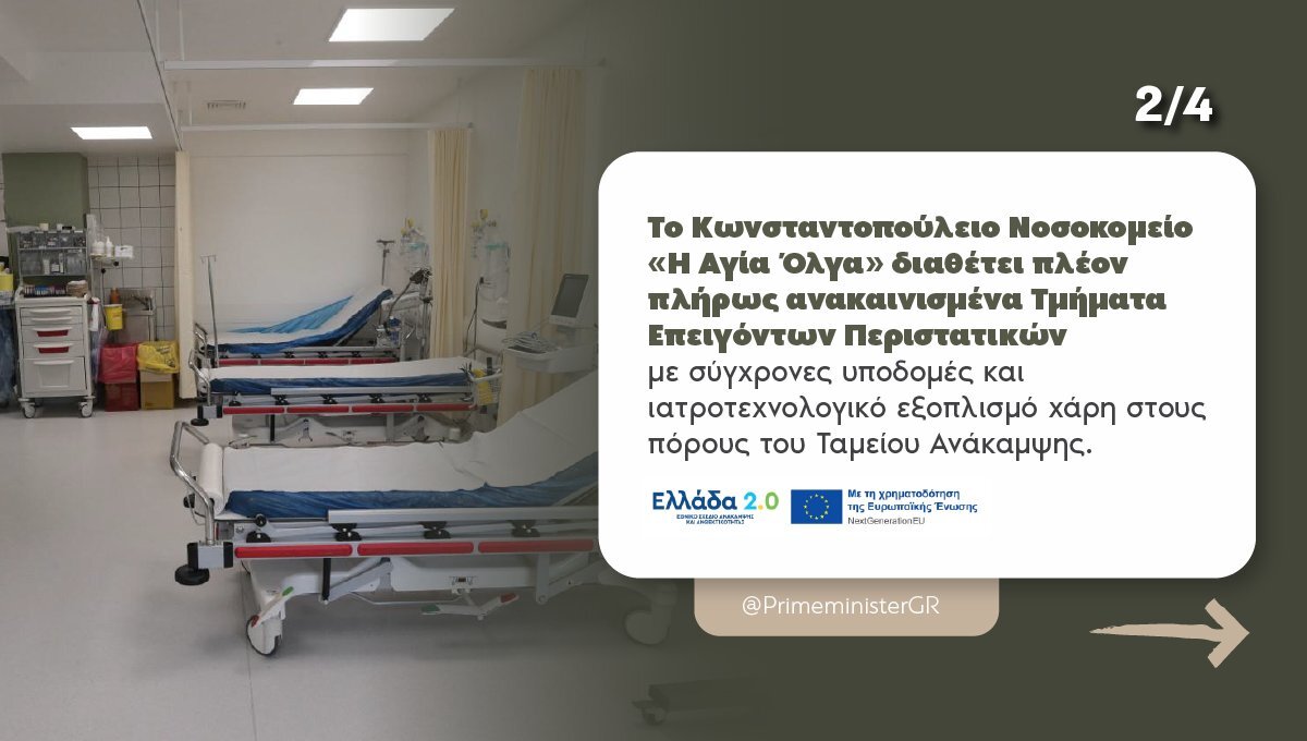 Άλλο ένα δημόσιο νοσοκομείο μας, το Κωνσταντοπούλειο «Η Αγία Όλγα», διαθέτει πλέον πλήρως ανακαινισμένα τμήματα Επειγόντων Περιστατικών με σύγχρονες υποδομές και ιατροτεχνολογικό εξοπλισμό. Πρόκειται για μια πλήρη ανακαίνιση υποδομών και εξοπλισμού μέσω του Ταμείου Ανάκαμψης, σε ένα νοσοκομείο που εξυπηρετεί πάνω από 500 ασθενείς σε κάθε 24ωρη εφημερία. Γνωρίζουμε την πίεση που δέχεται το ΕΣΥ και γι’ αυτό η σωστή αξιοποίηση των ευρωπαϊκών πόρων πρέπει να καταλήγει σε τέτοια χειροπιαστά έργα. Είναι ένα ακόμα βήμα στην προσπάθεια για ένα σύστημα υγείας πιο λειτουργικό και πιο αξιόπιστο στην πράξη.