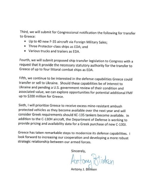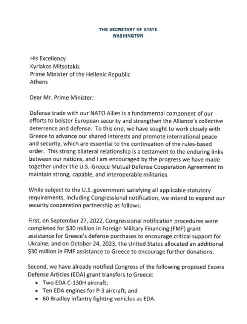 Αναλυτικά άτυπη μετάφραση της επιστολής Μπλίνκεν στον Μητσοτάκη με την πλήρη στρατιωτική ενίσχυση της Ελλάδας από τις ΗΠΑ: