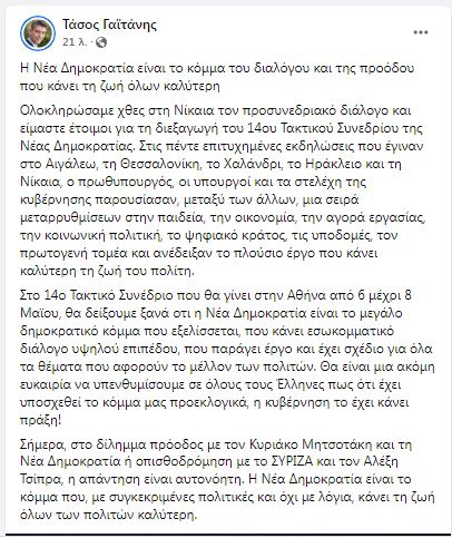«Η Νέα Δημοκρατία είναι το κόμμα του διαλόγου και της προόδου που κάνει τη ζωή όλων καλύτερη», αναφέρει ο Τάσος Γαϊτάνης, σε ανάρτησή του στο Facebook, με αφορμή την ολοκλήρωση του προσυνεδριακού διαλόγου ενόψει του 14ου τακτικού συνεδρίου της ΝΔ. που θα πραγματοποιηθεί στην Αθήνα από τις 6 έως τις 8 Μαΐου.