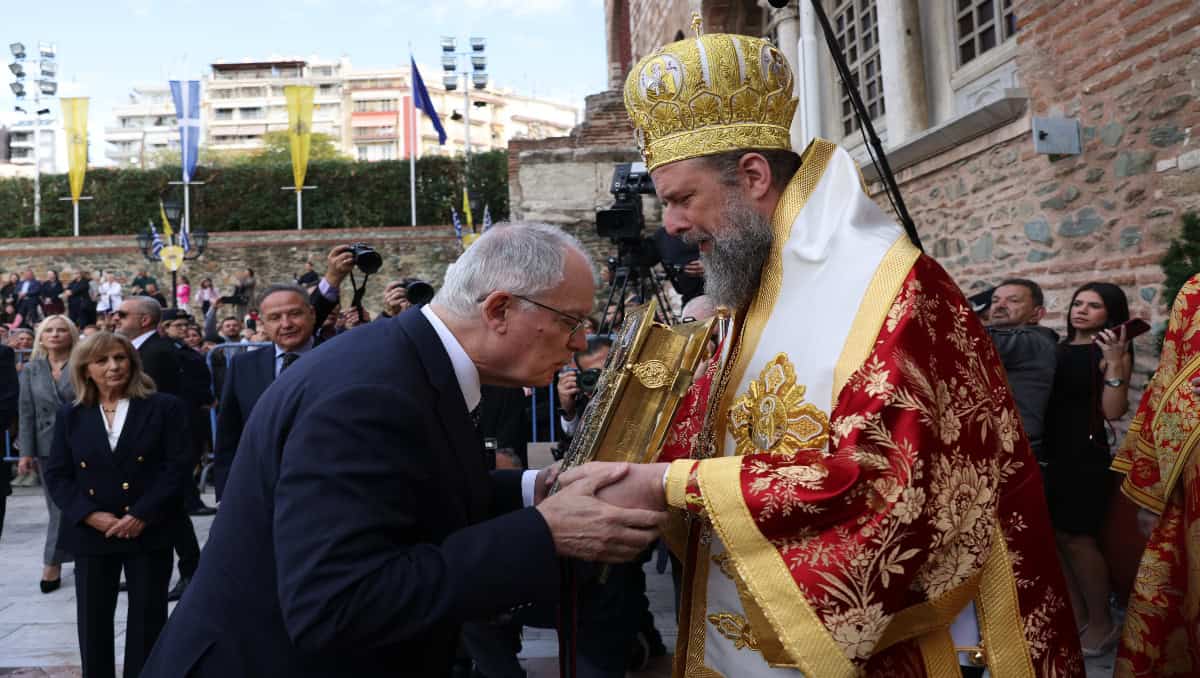 «Τη σημερινή μέρα, εδώ στη Θεσσαλονίκη, βαρύνουν δύο σπουδαίες και ονομαστές γιορτές. Μία γιορτή πίστεως και μια γιορτή ελευθερίας. Γιορτάζουμε τον Άγιο Δημήτριο τον Μεγαλομάρτυρα, τον Πολιούχο της Θεσσαλονίκης, τον μέγα της Θεσσαλονίκης φρουρών, ο οποίος με αυταπάρνηση και γενναιότητα υπερασπίστηκε τη χριστιανική του πίστη εις βάρος της ζωής του την εποχή των τρομακτικών διωγμών του αυτοκράτορα Διοκλητιανού και του καίσαρα Γαλέριου. Είναι ο Άγιος ο δημοφιλέστερος, είναι ο Άγιος ο οποίος πάντα σκέπει και προστατεύει τη Θεσσαλονίκη.