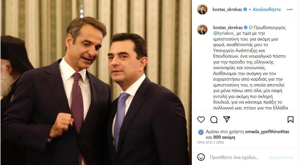 Στην εμπιστοσύνη του Κυριάκου Μητσοτάκη αλλά και στην σκληρή δουλειά που έπεται αναφέρθηκε σε ανάρτησή του στα social media o νέος Υπουργός Ανάπτυξης, Κώστας Σκρέκας.