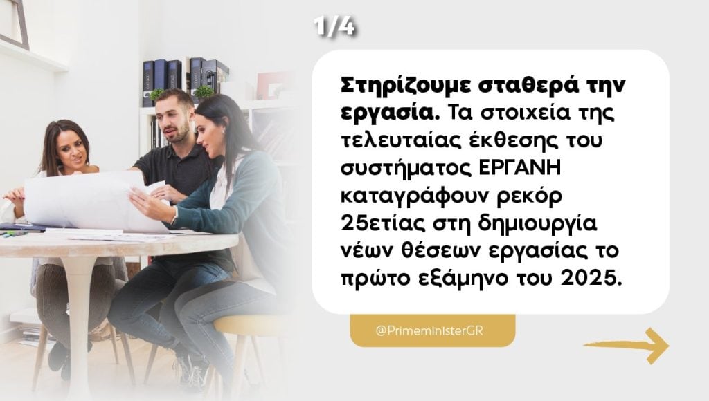 Ο πρωθυπουργός Κυριάκος Μητσοτάκης στην καθιερωμένη εβδομαδιαία ανασκόπηση του κυβερνητικού έργου, μέσα από τον προσωπικό του λογαριασμό στο Facebook, αναφέρθηκε στην τελευταία έκθεση του συστήματος ΕΡΓΑΝΗ και το ρεκόρ 25ετίας στη δημιουργία νέων θέσεων εργασίας το πρώτο εξάμηνο του 2025. Αναφορικά με την εθνική οδό Πατρών-Πύργου επισήμανε πως «η ολοκλήρωση του έργου αποτελεί έναν ελάχιστο φόρος τιμής σε όσους χάθηκαν άδικα σε αυτόν τον δρόμο».