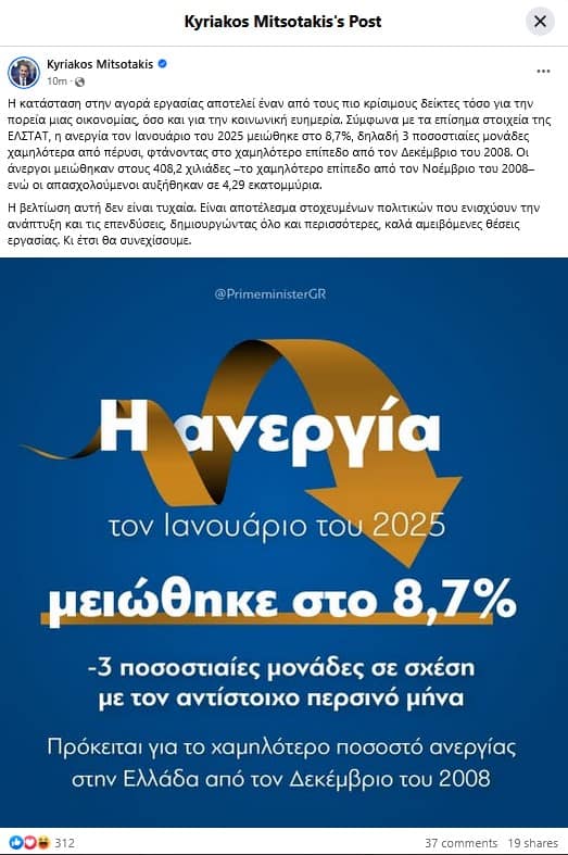 «Η κατάσταση στην αγορά εργασίας αποτελεί έναν από τους πιο κρίσιμους δείκτες τόσο για την πορεία μιας οικονομίας, όσο και για την κοινωνική ευημερία. Σύμφωνα με τα επίσημα στοιχεία της ΕΛΣΤΑΤ, η ανεργία τον Ιανουάριο του 2025 μειώθηκε στο 8,7%, δηλαδή 3 ποσοστιαίες μονάδες χαμηλότερα από πέρυσι, φτάνοντας στο χαμηλότερο επίπεδο από τον Δεκέμβριο του 2008. Οι άνεργοι μειώθηκαν στους 408,2 χιλιάδες –το χαμηλότερο επίπεδο από τον Νοέμβριο του 2008– ενώ οι απασχολούμενοι αυξήθηκαν σε 4,29 εκατομμύρια.