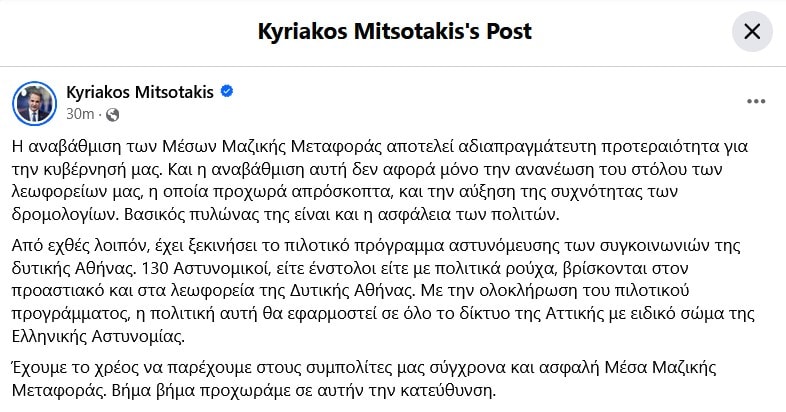 Ο Πρωθυπουργός Κυριάκος Μητσοτάκης σε ανάρτηση του στο Facebook αναφέρθηκε στο πιλοτικό πρόγραμμα αστυνόμευσης των συγκοινωνιών της δυτικής Αθήνας, και τόνισε ότι «η αναβάθμιση των Μέσων Μαζικής Μεταφοράς αποτελεί αδιαπραγμάτευτη προτεραιότητα για την κυβέρνησή μας».