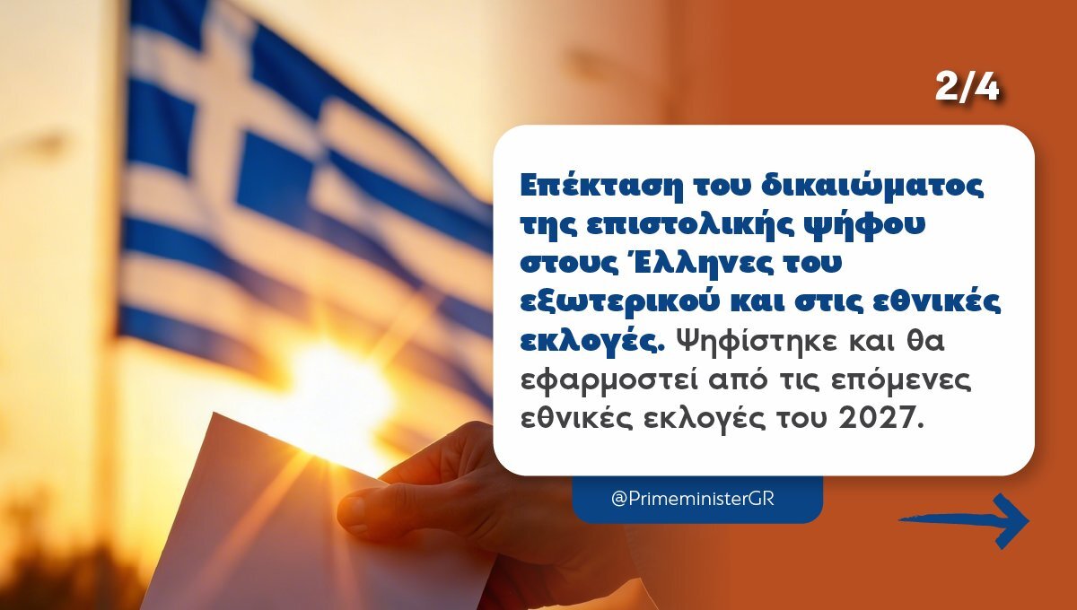 Πρώτον, ψηφίστηκε από τη Βουλή η πρωτοβουλία μας για την επέκταση της επιστολικής ψήφου και στις εθνικές εκλογές για τους Έλληνες του εξωτερικού. Πρόκειται για μια θεσμική τομή που φέρνει πιο κοντά την Ελλάδα με την ομογένεια και δίνει τη δυνατότητα στους Έλληνες του εξωτερικού να συμμετέχουν πιο εύκολα στις εθνικές εκλογές. Η ρύθμιση συγκέντρωσε την απαιτούμενη από το Σύνταγμα πλειοψηφία των 200 βουλευτών -201 ψήφους για την ακρίβεια- και θα εφαρμοστεί από τις επόμενες εθνικές εκλογές, το 2027. Ωστόσο, η πολιτική τόλμη της αντιπολίτευσης ήταν -επιτρέψτε μου να πω- κολοβή. Κι αυτό γιατί τα κόμματα δεν στήριξαν και τη σύσταση της ειδικής τριεδρικής Περιφέρειας Απόδημου Ελληνισμού, όπου οι εκτός συνόρων εγγεγραμμένοι εκλογείς θα μπορούσαν να ψηφίζουν με σταυρό τους εκπροσώπους τους στο ελληνικό κοινοβούλιο. Έτσι, η επιστολική ψήφος θα εφαρμοστεί από τις επόμενες εθνικές εκλογές, ενώ η ειδική εκλογική περιφέρεια θα τεθεί σε ισχύ 18 μήνες αργότερα. Όπως και να έχει, είναι μια κατάκτηση.