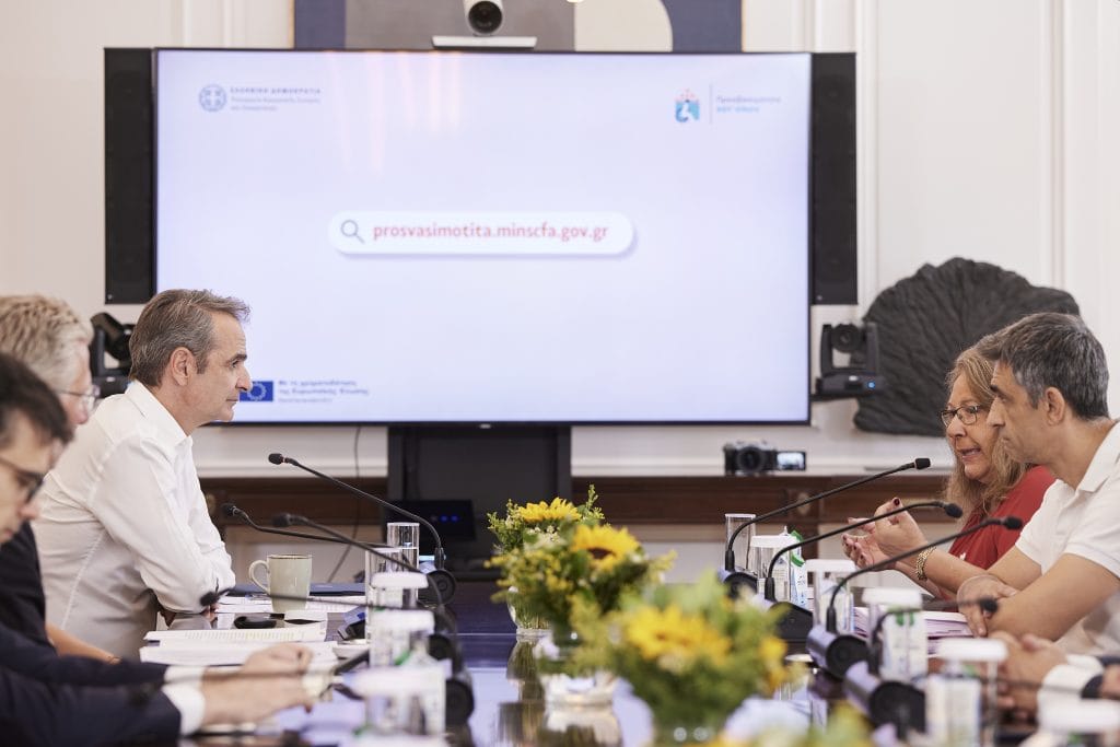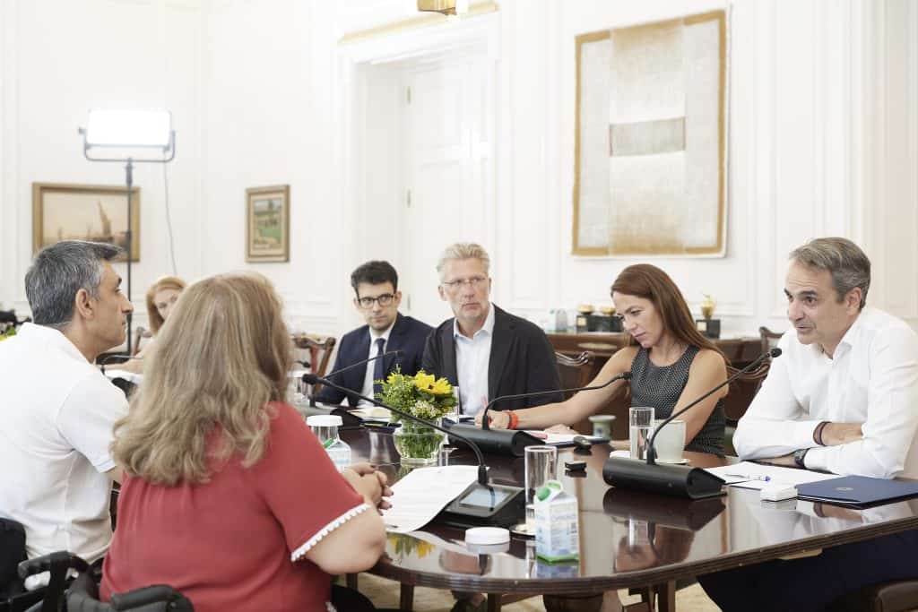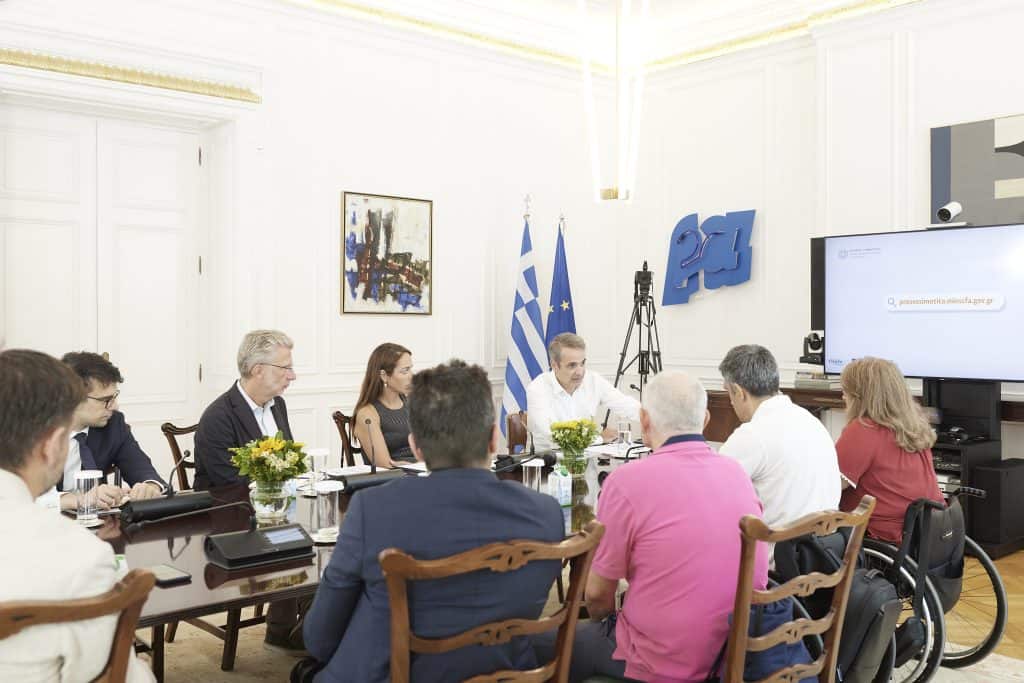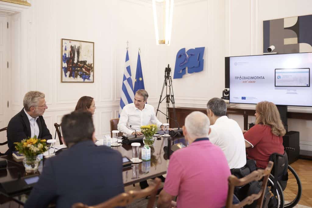 Ο πρωθυπουργός Κυριάκος Μητσοτάκης συναντήθηκε σήμερα στο Μέγαρο Μαξίμου με εκπροσώπους της αναπηρικής κοινότητας, με τους οποίους συζήτησε την πορεία του προγράμματος «Προσβασιμότητα κατ’ οίκον», μέσω του οποίου το κράτος για πρώτη φορά επιδοτεί έργα, όπως η κατασκευή ράμπας ή η τοποθέτηση αναβατορίου, που διασφαλίζουν την απρόσκοπτη πρόσβαση ατόμων με αναπηρία στις κατοικίες ή στους χώρους εργασίας τους.