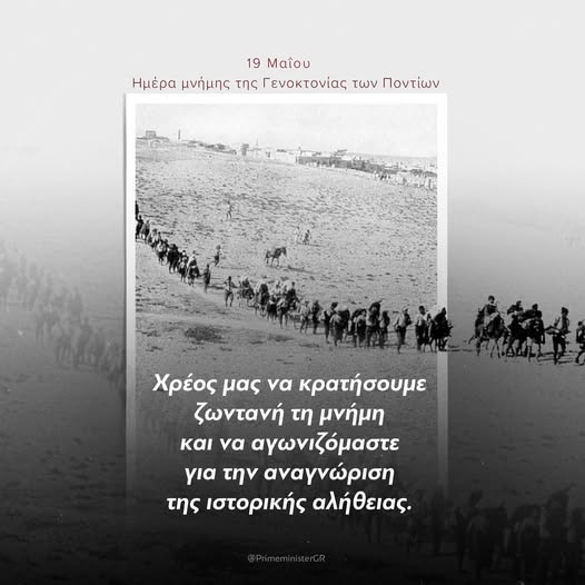 «Τιμούμε και εφέτος τη μνήμη χιλιάδων Ελλήνων του Πόντου που ξεριζώθηκαν από τις εστίες τους, εξοντώθηκαν και βασανίστηκαν. Πρόκειται για μία μαύρη σελίδα στην παγκόσμια ιστορία, που παραβιάζει τον πυρήνα κάθε αξίας ανθρωπισμού. Αποτελεί χρέος μας να κρατήσουμε ζωντανή τη μνήμη και να αγωνιζόμαστε για την αναγνώριση της ιστορικής αλήθειας, χωρίς να λησμονούμε το παρελθόν» αναφέρει σε ανάρτησή του στα μέσα κοινωνικής δικτύωσης ο πρωθυπουργός Κυριάκος Μητσοτάκης αναφερόμενος στη γενοκτονία των Ποντίων.