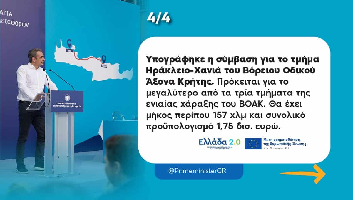 Θα μεταφερθούμε, έστω και νοερά, στην αγαπημένη μου Κρήτη και σε μια πολύ σημαντική εξέλιξη για ένα από τα πιο πολυσυζητημένα έργα υποδομής, τον ΒΟΑΚ. Υπογράψαμε προχθές τη σύμβαση παραχώρησης του κύριου τμήματος του έργου Ηράκλειο-Χανιά. Είναι μια προσωπική δέσμευση που είχα αναλάβει και χαίρομαι ιδιαίτερα που γίνεται πράξη. Το τμήμα αυτό είναι το μεγαλύτερο και πιο σύνθετο από τα τρία τμήματα της ενιαίας χάραξης του ΒΟΑΚ, με ορίζοντα ολοκλήρωσης τα πέντε χρόνια. Για να καταλάβετε την πολυπλοκότητα, μιλάμε για 157 χλμ μήκος, 43 κόμβους, 23 σήραγγες και 89 γέφυρες.