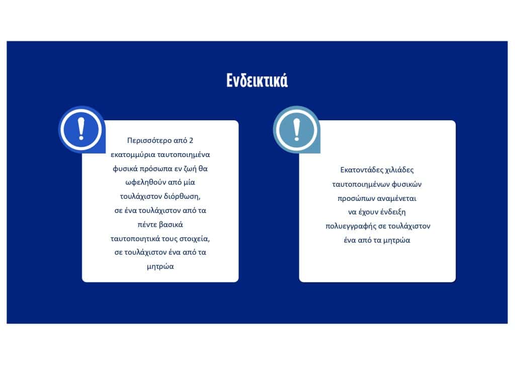 Με τον τρόπο αυτό θα βελτιωθεί η παροχή υπηρεσιών και παράλληλα θα αντιμετωπιστούν χρόνια κενά στη διασύνδεση κρατικών μητρώων, που είχαν ως συνέπεια την ταλαιπωρία των πολιτών και τον περιορισμό της αποτελεσματικότητας των υπηρεσιών του Δημοσίου.