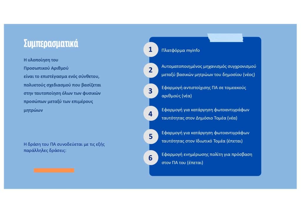 H χρήση του Προσωπικού Αριθμού θα διευκολύνει την ανταλλαγή δεδομένων μεταξύ διαφορετικών δημόσιων υπηρεσιών, βελτιώνοντας τη συνεργασία και την αποτελεσματικότητα, και παράλληλα θα επιτρέψει τη δημιουργία ακριβών και αξιόπιστων στατιστικών στοιχείων.