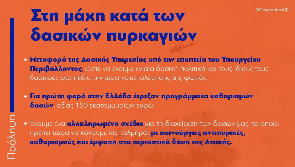 «Το 2019 αναλάβαμε τη δέσμευση να θέσουμε τα ζητήματα της Πολιτικής Προστασίας σε απόλυτη προτεραιότητα. Τη δέσμευση αυτήν την υλοποιήσαμε. Προφανώς, όμως πρέπει να γίνουν πολλά περισσότερα. Οφείλουμε να χτίσουμε πάνω σε όσα πετύχαμε», αναφέρει ανάρτηση του ο πρωθυπουργός Κυριάκος Μητσοτάκης, στην οποία παραθέτονται και εικόνες με τα μέτρα της κυβέρνησης κατά των πυρκαγιών.