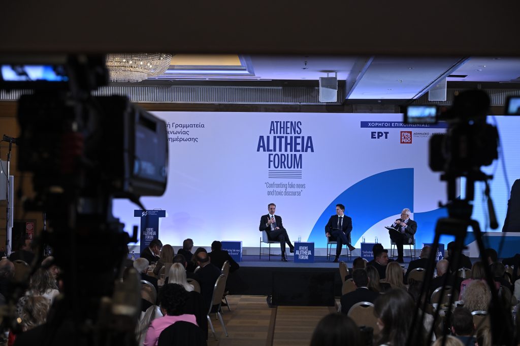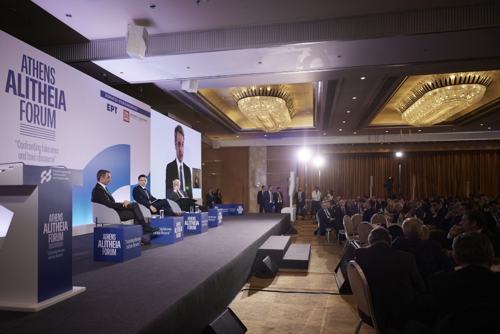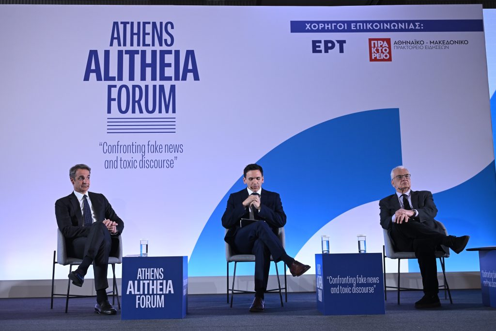 Ο Πρωθυπουργός Κυριάκος Μητσοτάκης συμμετείχε σε συζήτηση με τον Γιάννη Θεοχάρη, Καθηγητή Ψηφιακής Διακυβέρνησης και κάτοχο της ομώνυμης έδρας στο Τεχνικό Πανεπιστήμιο του Μονάχου, και τον Γιάννη Πρετεντέρη, εκδότη της εφημερίδας «Το Βήμα», με θέμα «Διαλέγοντας Πραγματικότητα: Η Απειλή της Παραπληροφόρησης», στο πλαίσιο του συνεδρίου «Athens Alitheia Forum». Ακολουθούν οι τοποθετήσεις του Πρωθυπουργού: