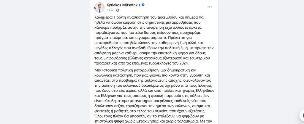 Ο Κυριάκος Μητσοτάκης έκανε ειδική αναφορά στην επιστολική ψήφο σήμερα (3.12.2023) στην καθιερωμένη εβδομαδιαία ανασκόπηση που κάνει ο πρωθυπουργός στη σελίδα του στο Facebook, αλλά δεν έμεινε μόνο εκεί.