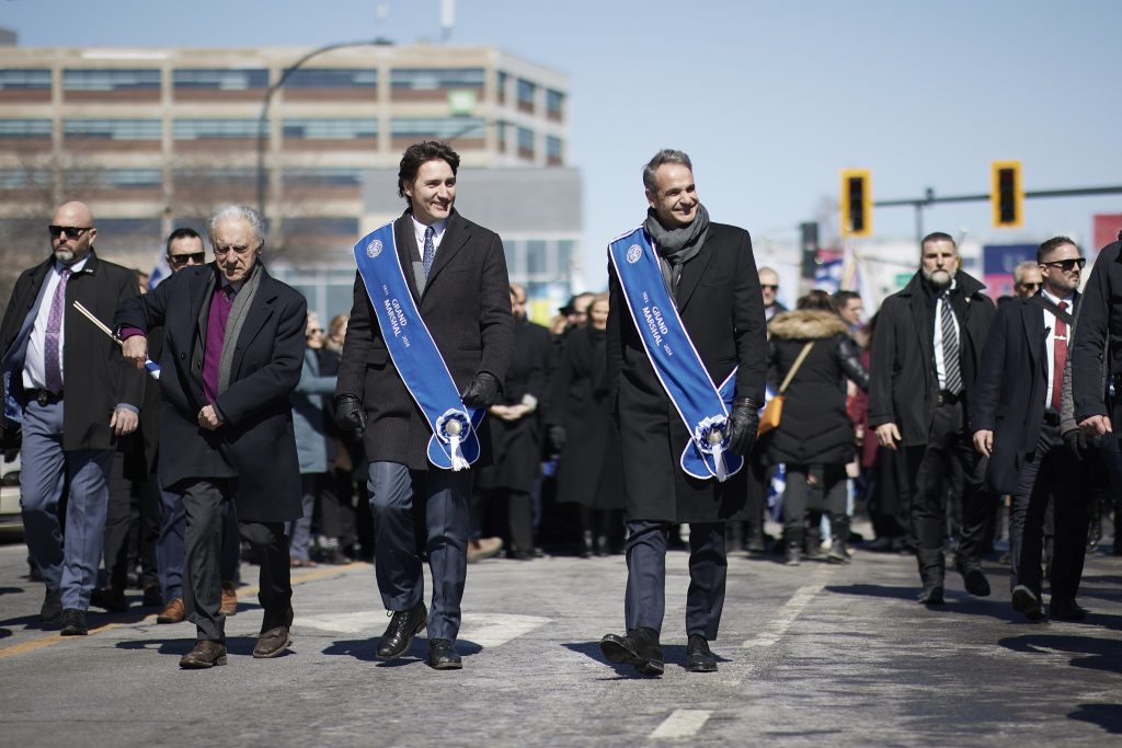 Ο πρωθυπουργός Κυριάκος Μητσοτάκης βρίσκεται σήμερα στον Καναδά, όπου παρακολούθησε την παρέλαση συλλόγων της Ελληνικής Κοινότητας Μείζονος Μόντρεαλ για την εθνική εορτή της 25ης Μαρτίου, μαζί με τον Καναδό ομόλογό του Justin Trudeau.