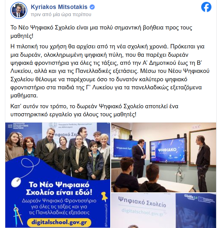 O Κυριάκος Μητσοτάκης έκανε την εξής ανάρτηση στο Facebook για το Νέο Ψηφιακό Σχολείο: