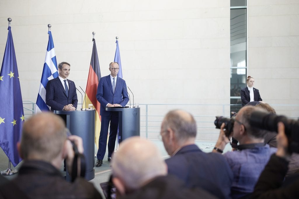 Ακολούθησαν διμερείς συνομιλίες και κοινή συνέντευξη Τύπου. Ο Κυριάκος Μητσοτάκης, συνεχάρη τον Φρίντριχ Μερτς για την εκλογή του στην Καγκελαρία.