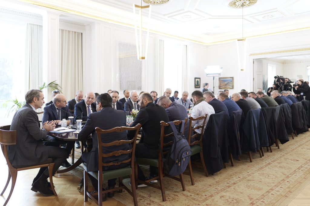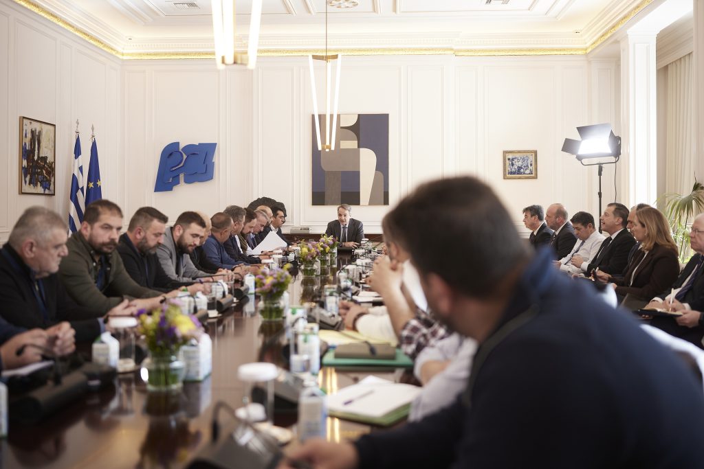 Ο Πρωθυπουργός Κυριάκος Μητσοτάκης συναντήθηκε με εκπροσώπους κτηνοτρόφων στο Μέγαρο Μαξίμου, σε συνέχεια του θεσμικού διαλόγου της κυβέρνησης με παραγωγούς για την επίλυση των ζητημάτων που αντιμετωπίζει ο πρωτογενής τομέας και με επίκεντρο τον σχεδιασμό του μέλλοντός του, ώστε να διασφαλιστεί η εξωστρεφής ανάπτυξή του, η πιστοποίηση και ανταγωνιστικότητα των ελληνικών προϊόντων, αλλά και η ανθεκτικότητα της ελληνικής παραγωγής.