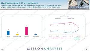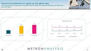 Ενδιαφέρον παρουσιάζει το εύρημα της Metron Analysis ότι η Πλεύση Ελευθερίας παρουσιάζει σημαντική άνοδο – ανεβαίνει από το 4,8% στην εκτίμηση ψήφου στο 7,3% μέσα σε έναν μήνα, δηλαδή μόλις 0,1 της μονάδας πίσω από τον ΣΥΡΙΖΑ, ο οποίος και σε αυτή την μέτρηση εμφανίζεται στην πέμπτη θέση, πίσω από το ΚΚΕ και την Ελληνική Λύση. Το κόμμα Κασσελάκη εμφανίζεται στο 4,1% και συνολικά, η εταιρεία δίνει το εισιτήριο για τη Βουλή σε 9 κόμματα, αφήνοντας οριακά εκτός το ΜεΡΑ25 και τη Νέα Αριστερά.