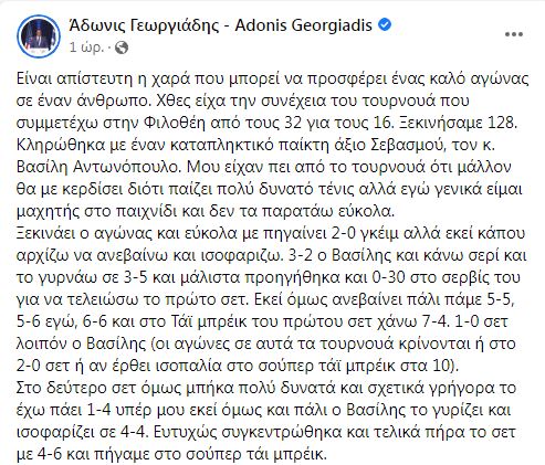 Έχοντας προκριθεί στους «16» τουρνουά τένις στη Φιλοθέη ο Άδωνις Γεωργιάδης περιγράφει την εμπειρία και ειδικά τον χθεσινό αγώνα που έδωσε με έναν πολύ σκληρό αντίπαλο και εξαιρετικό παίκτη.