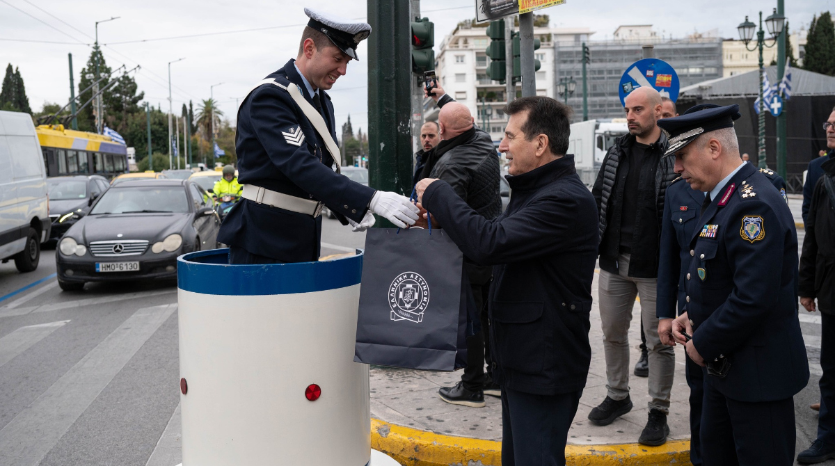 Η Πολιτική και Φυσική Ηγεσία της Ελληνικής Αστυνομίας προσέφερε σήμερα, Τετάρτη 31 Δεκεμβρίου 2025, δώρα σε τροχονόμους οι οποίοι εκτελούσαν υπηρεσία ρύθμισης της κυκλοφορίας στο Σύνταγμα, καθώς και σε Πειραιά, Κηφισιά, Αιγάλεω και Γλυφάδα.