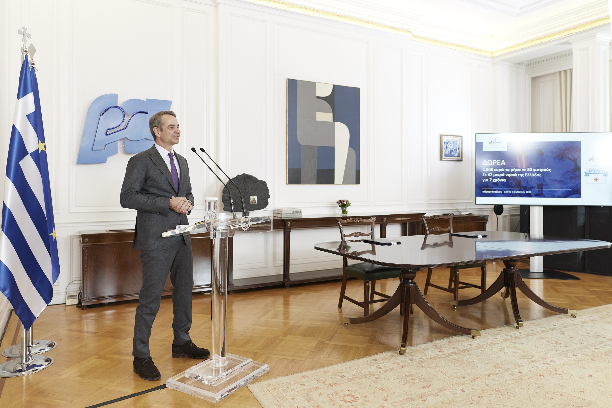 Ο Πρωθυπουργός Κυριάκος Μητσοτάκης παρέστη το μεσημέρι στην εκδήλωση παρουσίασης της δωρεάς του Φιλανθρωπικού Ιδρύματος Στέλιος Χατζηιωάννου, που αποσκοπεί στην ενίσχυση των αποδοχών 80 γιατρών και αγροτικών γιατρών που υπηρετούν με φυσική παρουσία σε 47 μικρά νησιά της Ελλάδας.