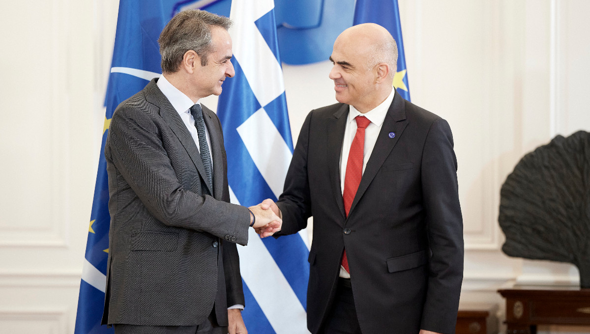 Alain Berset: Σας ευχαριστώ θερμά, κ. Πρωθυπουργέ, γι’ αυτή την εγκάρδια υποδοχή σήμερα εδώ στην Αθήνα. Είναι τεράστια χαρά και τιμή που έχω την ευκαιρία να σας συναντήσω ξανά.