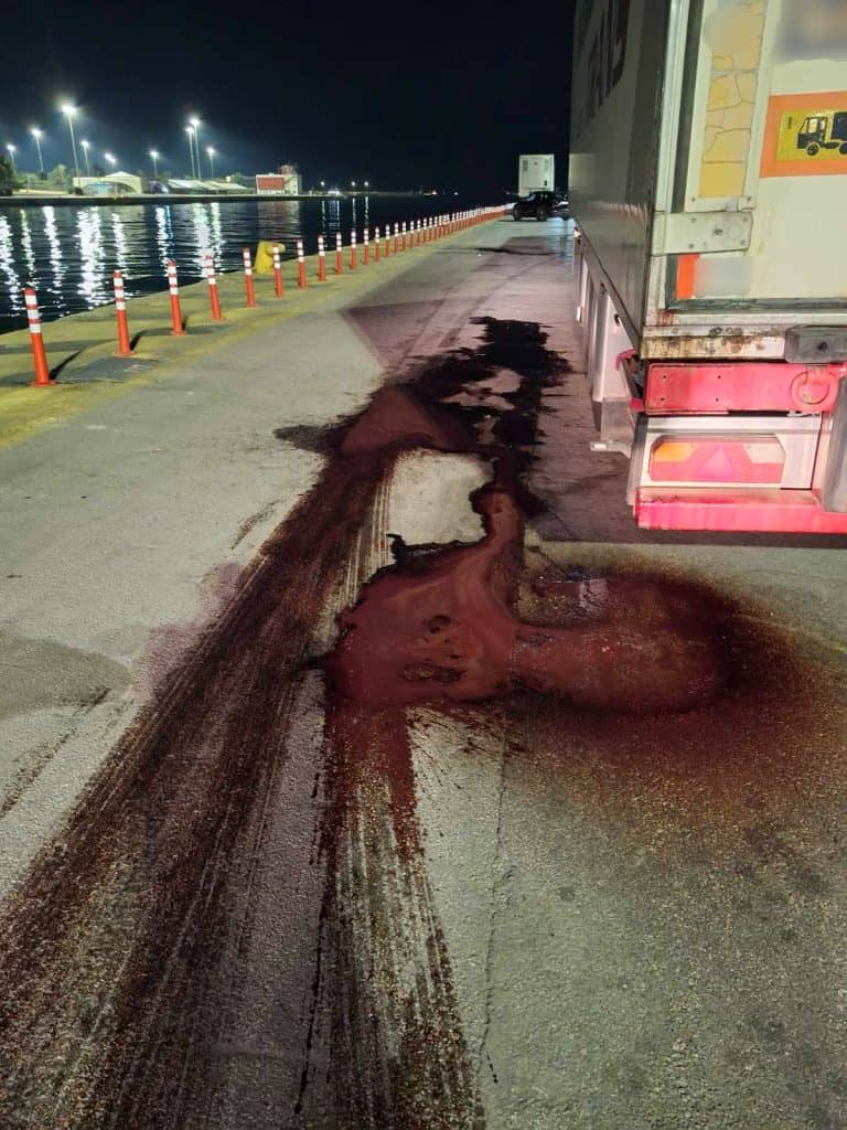 Οι κτηνίατροι της Περιφέρειας, που μετέβησαν άμεσα για αυτοψία, διαπίστωσαν την ύπαρξη φορτίου με 20.370 κιλά ζωικών υποπροϊόντων (13.784 κιλά χοιρινά υπολείμματα και 6.559 κιλά δέρματα χοίρων), ενώ από το εσωτερικό του οχήματος εξερχόταν αιματηρό υγρό, προκαλώντας έντονη δυσοσμία και μόλυνση του περιβάλλοντος χώρου.